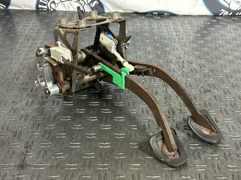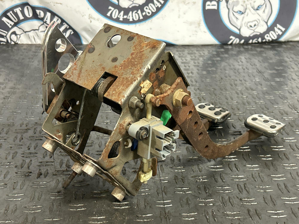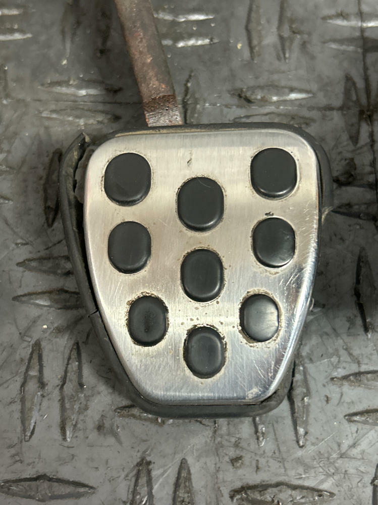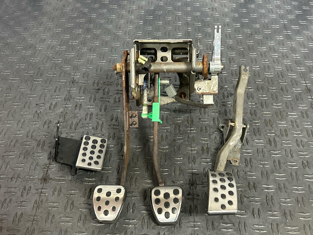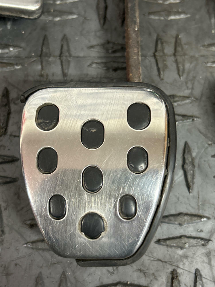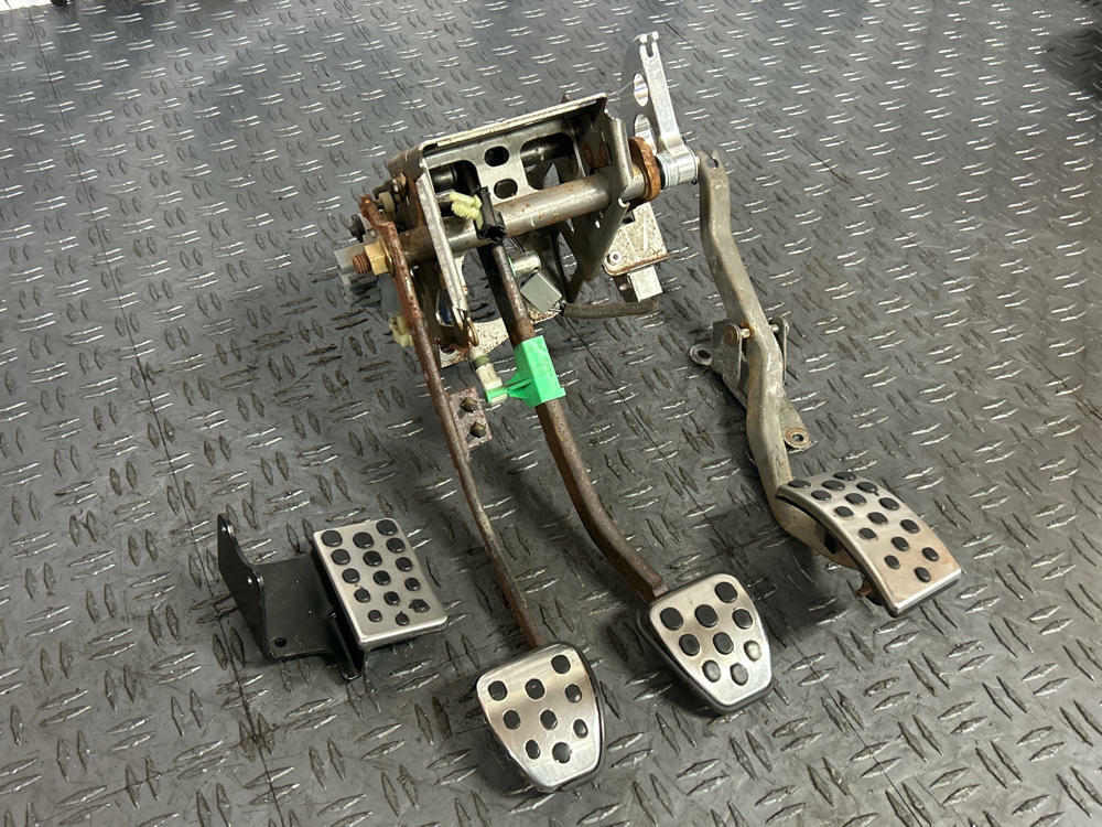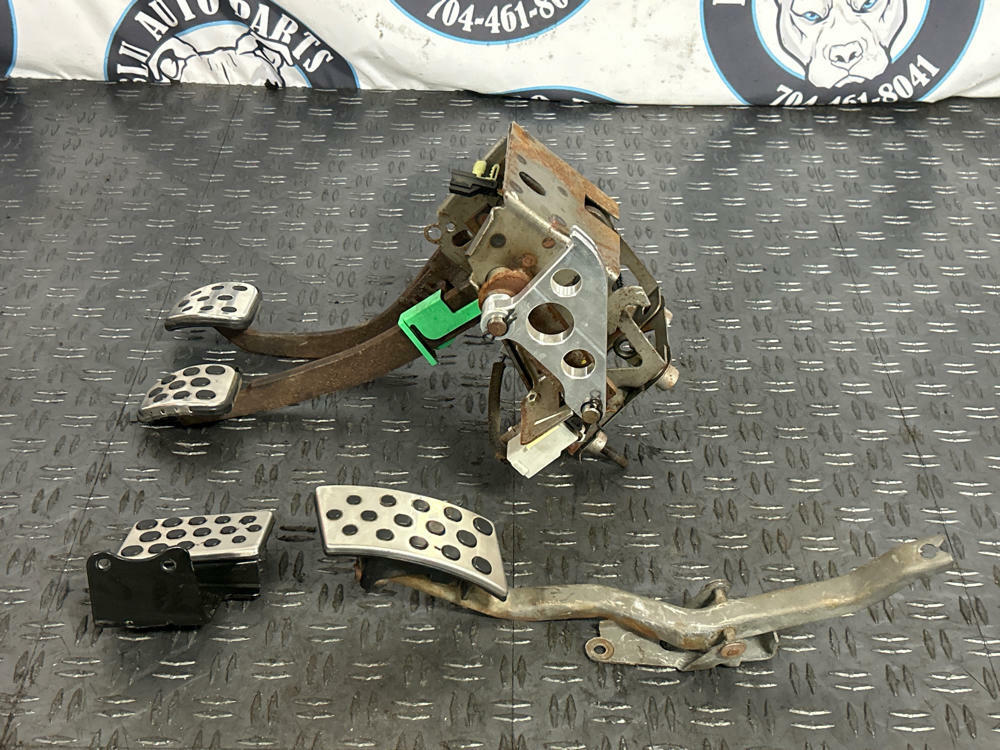 Gas pedal, brake pedal, and dead pedal all appear to be OEM. Some of the rubber trim is peeling around the chrome covers. Possibility of clutch pedal cover being a reproduction piece. Appears slightly newer than the other pedal covers and has different amount of wear on the black dot-matrix. Or could just be OEM and HEAVILY worn down. Pedals and the box in good working order. Drove car into the shop.