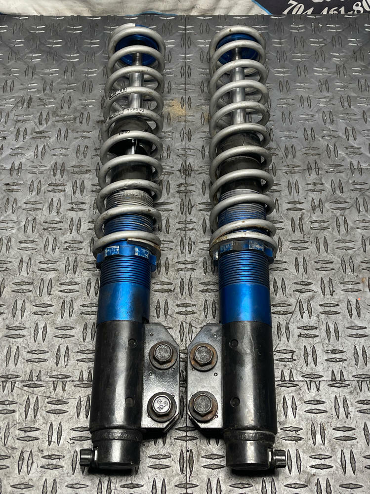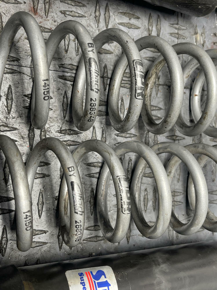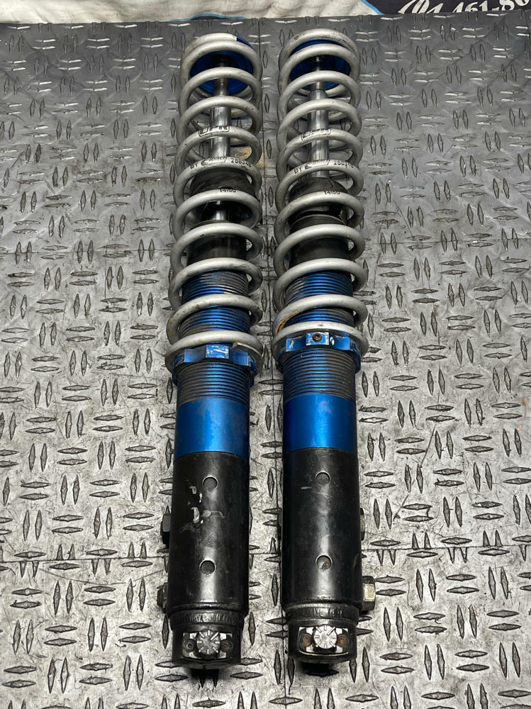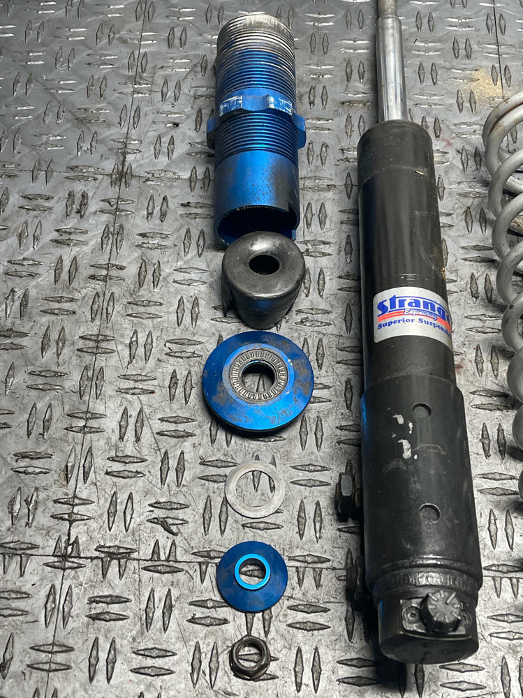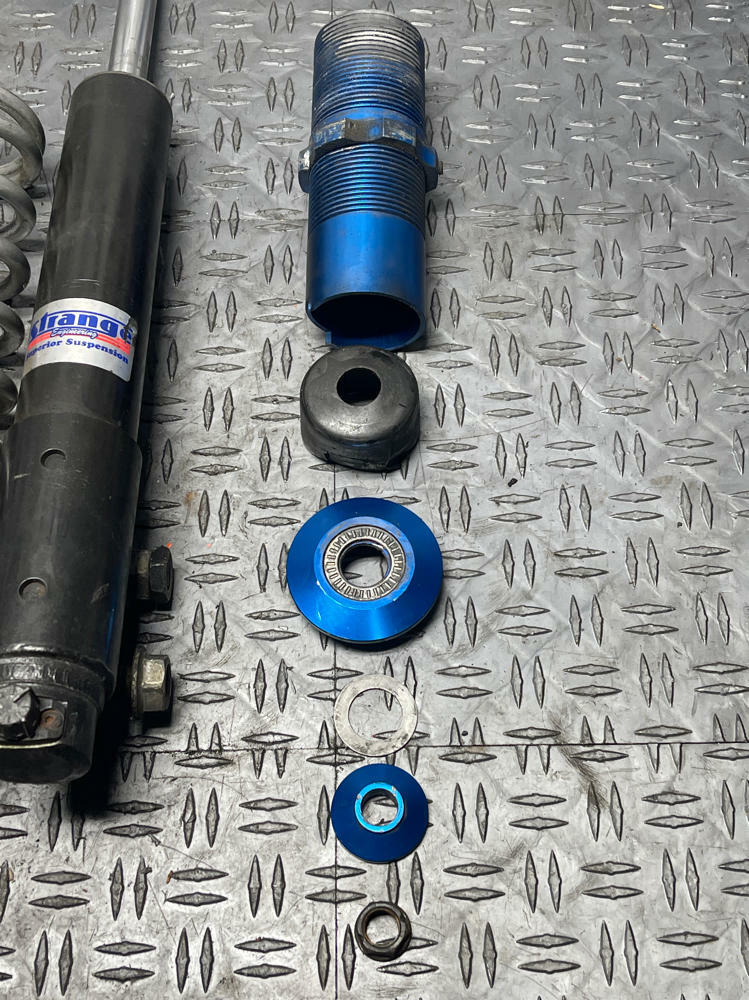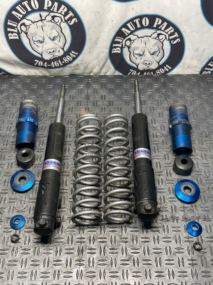 NOTE: Strange Struts, Eibach Conversion Kit, UPR Springs. One strut will have to be rebuilt or replaced; compresses and rebounds way too easily... even when the single way adjustable dial is moved. Blue conversion collars w/ spring perch are all beat up and the threads are cooked. Other assembly rebounds & compresses properly as it should. Everything shown in pics is what's included!